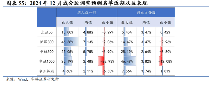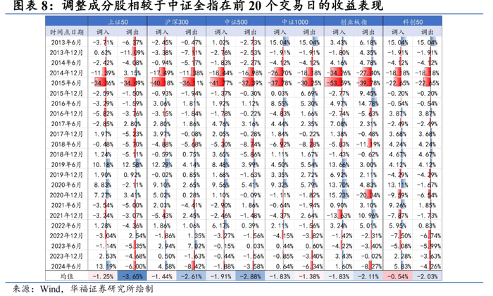 以中证全指为基准,对比调入的成分股与调出的成分股相对收益表现发现,定期调整前,调入成分股相教调出的成分股收益表现更优。