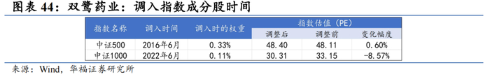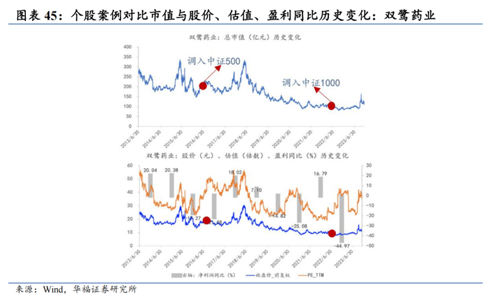 双鹭药业于2016年6月调入中证500指数,此前为沪深300指数的成分股,受到盈利下跌的影响,股票估值波动,股票在2018年6月至2022年6月经历估值、盈利双跌后于2022年6月调入中证1000指数。