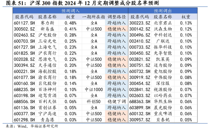 根据指数编制测算,预计上证50、沪深300指数本次12月份定期调整分别更换6、17只成分股样本,成分股调整名单如下表所示: