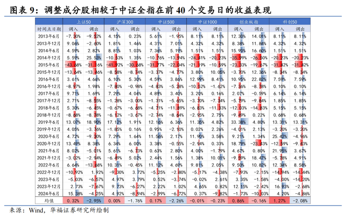 基于第一节对六个指数成分股定期调整前时序上的日均收益率对比结论,调入成分股受到投资者提前关注,从调整前40个交易日起至调整实施日期间的不同区间中或将取得较优的收益,可逐步关注。