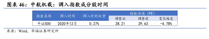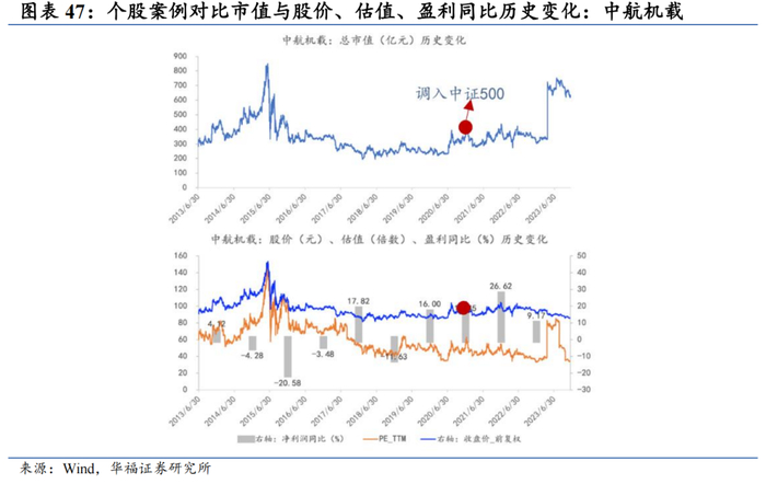 中航机载于2020年12月从沪深300调入中证500指数,同样经历盈利波动后估值和股价下跌处于低位的阶段。