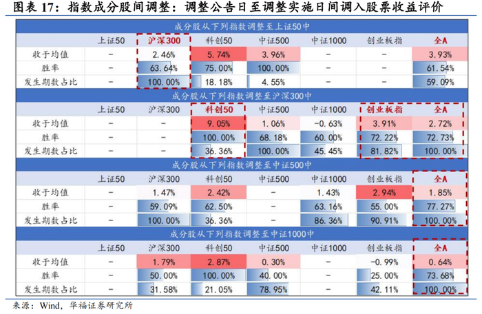 科创50和创业板指成分股调入沪深300中,调整公告日至调整实施日间收益胜率分别为100%和72.73%;创业板指成分股调整至中证500和中证1000指数的收益胜率只有55.00%和25.00%。