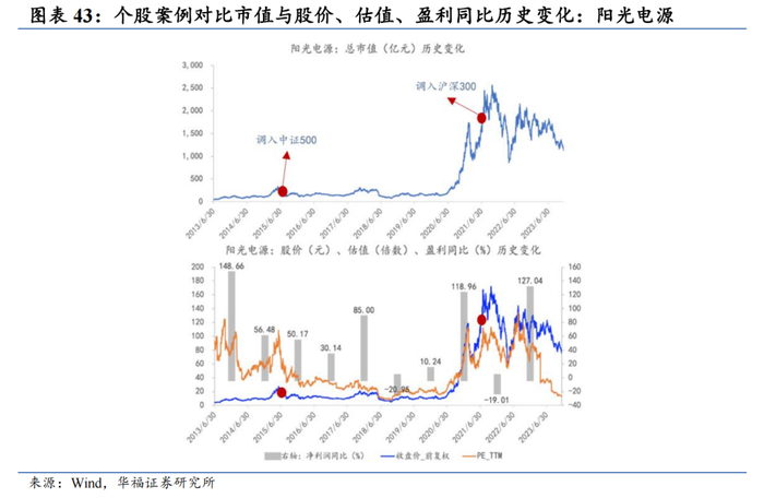 2015年6月,阳光电源从中证1000成分股上调至中证500中,于2015年6月调入中证500指数,高盈利估值拔升的阶段为中证500贡献正向收益定价,2020年末在中证500指数中成分股占比1.31%;2021年6月调入沪深300指数成分股中,此时公司已经处于估值高位,此后的盈利下滑阶段股价下跌给指数带来负向的定价冲击。