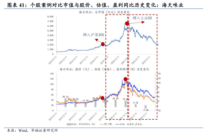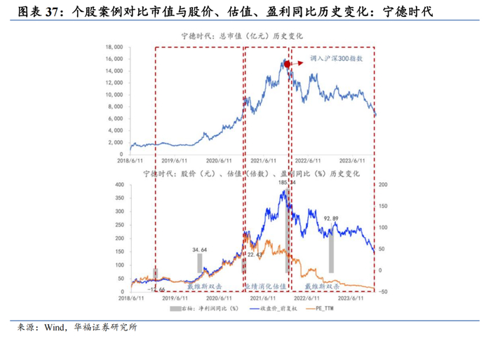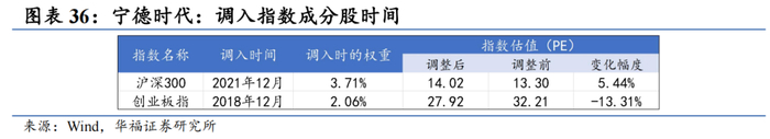 宁德时代于2018年12月调入创业板指数、2021年12月调入沪深300指数。对于沪深300指数来说,前期高盈利增长使得股票市值快速扩张后才调入指数,此时股价已被充分定价,加上2021下半年进入后资管新规时期,流入市场的增量资金减少使得股价无法进一步推升,资产估值出现快速下降,像宁德时代这类权重较大的成分股给指数带来负向的定价冲击,指数价格随之下行。
