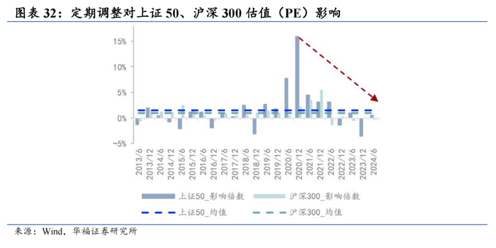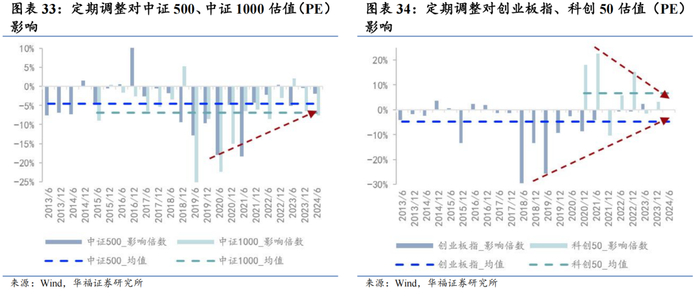 统计2013年6月28日起至2024年6月28日,指数定期调整对指数估值(PE)影响,上证50、沪深300和科创50大市值指数定期调整后估值(PE)平均上升1.47%、0.97%和6.64%,中证500、中证1000和创业板中小市值指数定期调整后估值(PE)平均下降4.61%、6.85%和4.72%。小市值指数的估值(PE)重构或调整幅度大于大市值指数估值的调整幅度。
