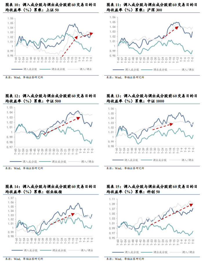 对于上证50、沪深300指数的成分股,前25个交易日至前12个交易日内,调入、调出成分股收益变动出现明显的分化,前11个交易日至调整当日分化差距较小。