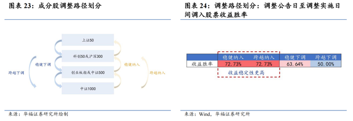 指数成分股调整公告日至调整实施日间,推荐关注稳健纳入和跨越纳入的个股,相较于稳健下调和跨越下调的股票收益更稳定。