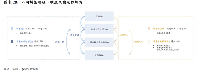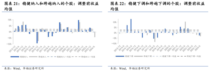 跨越调整成分股在调整日后收益差距和稳定性上明显低于调整前,跨越纳入和跨越下调成分股在调整后股价下跌。
