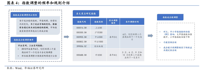 本研究报告中,我们聚焦研究主流宽基指数(上证50、沪深300、中证500、中证1000指数、创业板指、科创50)的成分股调整,分析其对指数及成分股价格变动、估值等影响。