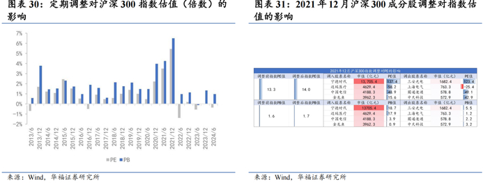 大市值股票对指数调整后的估值影响较大。沪深300指数在2021年12月的定期调整后估值变化较其他时间点更明显,原因是当期调整时调入调出市值较大的成分股,因此指数估值增加。