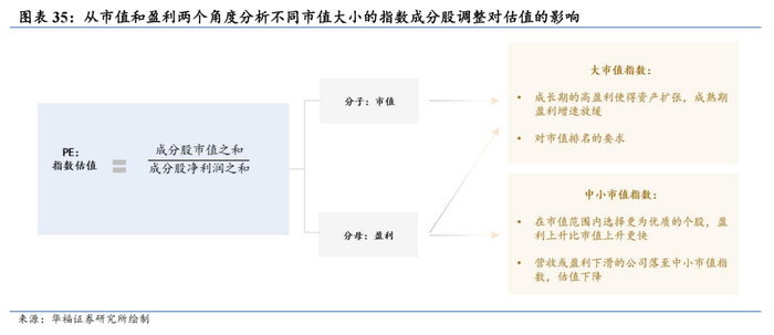 对于大市值指数的成分股筛选,成长期的高盈利使得个股资产扩张、股价上升后纳入大市值,因此指数调入的成分股估值一般更高,从而提升指数估值。