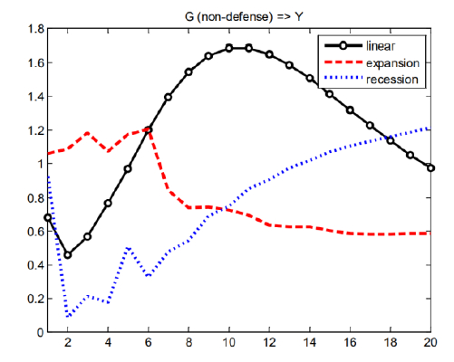注:图表显示了政府支出每增加1美元的脉冲响应。虚线显示了扩张(红色,长虚线)和衰退(蓝色,短虚线)的响应。带圆的实线表示线性模型中的响应。