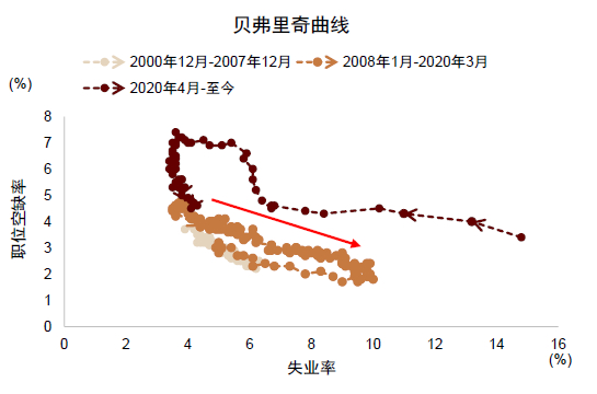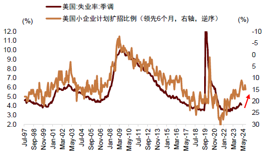 就业方面,虽然新增非农就业人数保持韧性,失业率上行过程也有所反复,但整体来看就业市场已经呈现明确转弱迹象,一方面,职位空缺数与员工工作平均时长回落、工资增速中位数下行,另一方面,前瞻指标美国小企业计划扩招比例显示美国失业率未来可能继续走高,贝弗里奇曲线也已经运行至拐点附近。