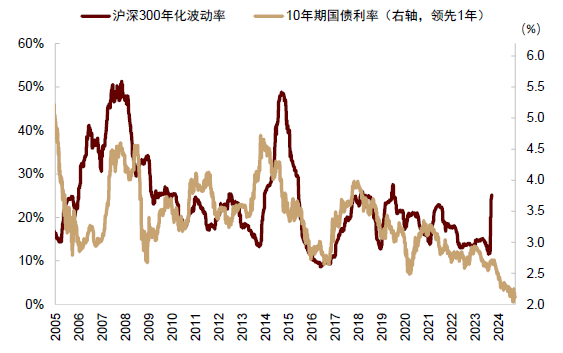 在国内会议与海外大选等事件冲击落地后,我们认为中国股票波动率可能在中长期逐渐确认下行通道:我们发现经济增长中枢与十年期国债利率走势一致,而沪深300波动率与利率同向运行,利率领先波动率1年左右,提示我们市场波动终将回落。