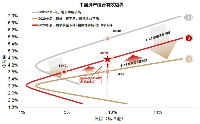 从上述3点资产运行新特征出发,结合周期运行规律,我们认为投资者可能需要在未来逐步调整资产配置比例。对于中国市场而言,股票波动性降低、股债相关性转负,意味着对冲同等幅度的股票风险需要更低的债券配置,我们在投资组合中可以把更多资产配置向股票,博取更高收益。