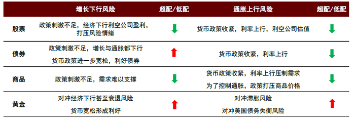 如上文分析,如果特朗普政策较快实施,对经济影响较大,可能形成通胀上行风险,打断美联储降息进程;如果特朗普政策普遍落地偏慢,对经济影响较小,或减税政策落地明显晚于关税移民政策,则可能形成增长下行风险。无论是通胀风险还是增长风险,股票都可能承压,因此我们建议中期逐步减配股票,增配安全资产。黄金既能对冲增长下行,也能对冲通胀上行,在两种情景都有表现机会,是安全资产的良好标的。通胀上行债券承压,增长下行债券受益,需要根据未来经济运行选择债券配置方向。商品或受挫于需求不足,或受挫于政策打压,两种情景表现均不佳,建议继续规避。