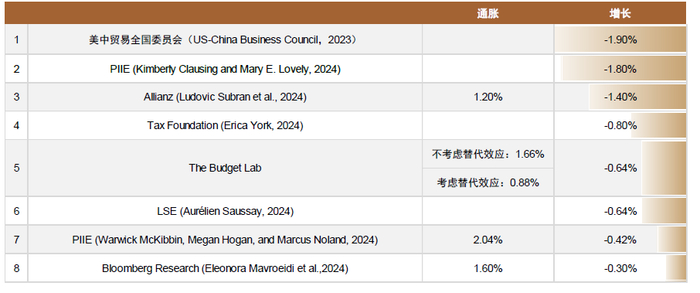 1) 关税政策由总统主导,有条件较快落地,或推高美国商品价格。特朗普在竞选中宣称对中国征收 60%全面关税,对其他国家征收 10%全面关税。2018 年中美贸易摩擦期间,美国从启动调查到正式征税历时近11个月。但如果特朗普再度当选,可以继续延用此前任期内的调查结论,加征关税有条件在较短时间内实施。我们认为如果这一政策较快落地,将对经济产生明显的“滞胀”效应。根据海外机构测算的中位数,假如特朗普在竞选中宣称的“对中国征收 60%全面关税,对其他国家征收 10%全面关税”落地,将拖累 2025 年美国GDP增速约1个百分点,同时推升美国通胀约1个百分点。