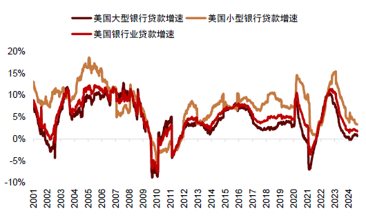 在美国高利率的背景下,信贷需求面临显著压力,难以保持此前的高速增长趋势。大中型企业虽然具有更强的抗风险能力和更为稳定的现金流,但高企的利率仍然使得企业在扩张时保持谨慎。美国银行业贷款增速在2024年初回落至2%附近低位震荡,至今未现明显反弹迹象。