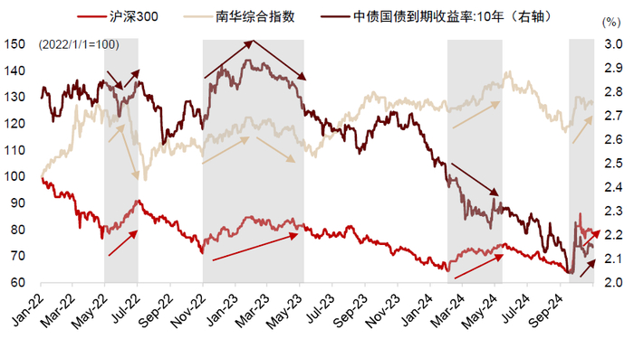 在每轮股市反弹期间,债市与商品往往不会简单跟随股市下跌或上涨。本轮市场反弹中,由于政策态度转向带来了经济全面修复的预期,因此股票、利率和商品资产呈同向上行态势,但后续仍需更多政策或经济基本面验证。