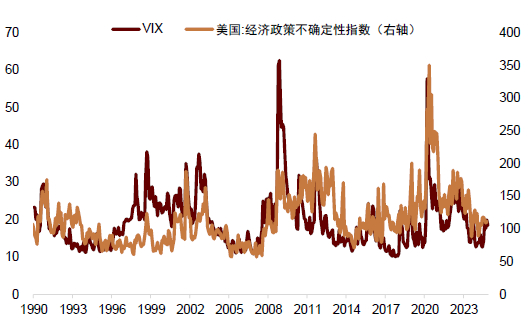 我们使用VIX指数来刻画美国股票市场的波动水平,发现美国市场波动率可能存在上行风险。一方面,由于本届大选后美国政治格局变化较大,经济政策不确定性提升,可能带动美国市场波动率上行。