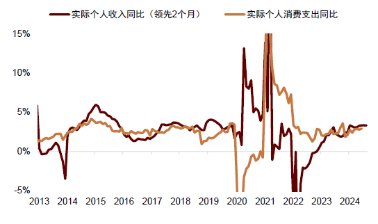 消费可能是美国经济中目前最具韧性的部门,最新的三季度GDP数据显示,个人消费支出环比折年率高达2.46%,创下近6个季度新高,贡献了GDP增长约90%的份额,实际消费支出与实际个人收入增速保持稳定,显示居民需求有望保持健康。