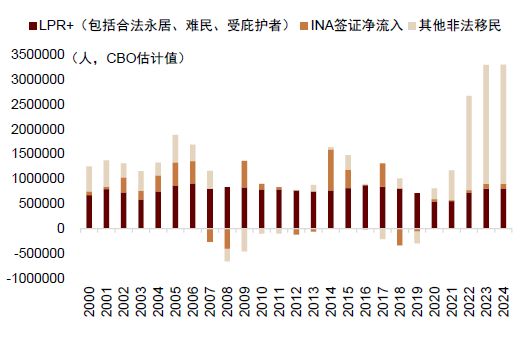 2) 限制非法移民,推动意愿高但执行难度大,若落地较快或推高工资与服务价格。根据美国国会预算办公室的估计,自 2020 年底以来,已有超过 900 万人通过合法和非法渠道移民美国,其中非法移民占比接近70%,相比2016-2020年非法移民负流入出现明显提升,是疫情后美国劳动力市场供给提升的重要力量,有助于促进增长降低通胀。
