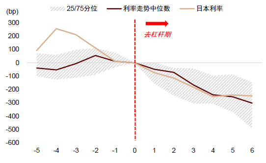 图表9:增长下行与货币宽松导致利率持续回落,信用周期拐点后5年下行幅度中位数达到255bp