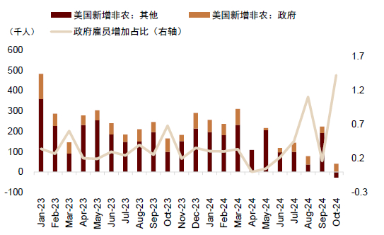在特朗普就职初期,还可能废除拜登政府的一系列财政支出安排,如《通胀削减法案》等。此外,特朗普在其竞选纲领中提出要削减浪费性联邦支出,精简政府的职能和规模,这可能会影响当前在非农就业中占比较高的政府临时雇员数量,从而打击就业市场。2024年下半年以来,政府雇员在新增非农中的比例不断攀升,在10月其他非农就业人数为负的情况下拉动非农就业总数转正。若非农就业中政府雇员数量下降,则可能加速就业市场降温进程,并推动失业率再度回升。