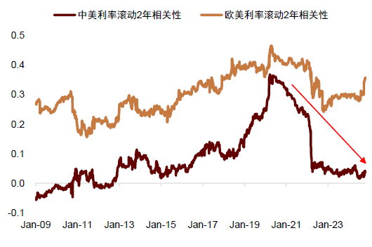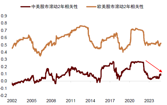 中国处于金融周期下半场,欧美处于金融周期上半场,叠加国家经济主义思潮回归,让全球经济由“大缓和”时代进入“大分化”时代。以股票为例,欧美股票大盘相关性当前为0.5左右,处于近20年来的中枢水平,但中美大盘相关性由0.25下降至0附近,位于历史低点。债券也表现出同样特征,欧美债市相关性保持在0.3上方较高水平,而中美债市相关性从最高0.36降至当前0附近。