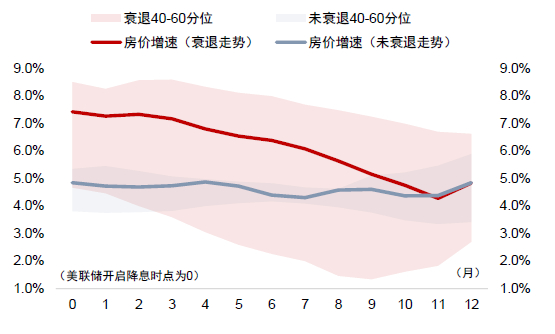 图表40:美联储降息后美国房价增速在软着陆时保持稳定,在硬着陆时持续走弱