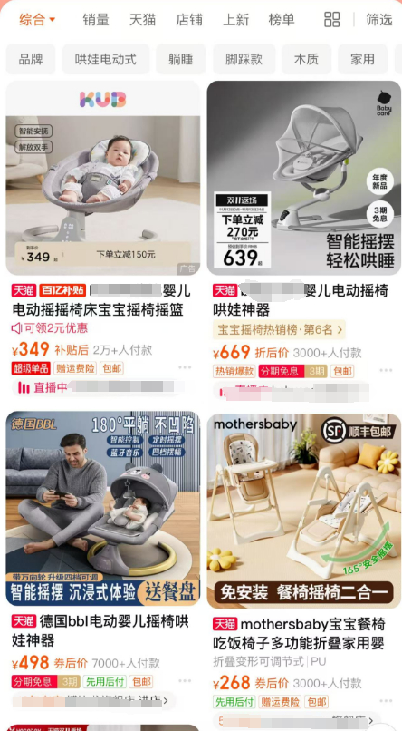 “双十一”促销活动刚刚结束,未来网记者调查发现,电商平台上许多品牌产品都有类似费雪召回的倾斜式婴儿摇椅。该类产品多辅以“甜睡床”“哄娃神器”“电动摇篮”等标签,价格在数百元,有店铺单品销量过万。