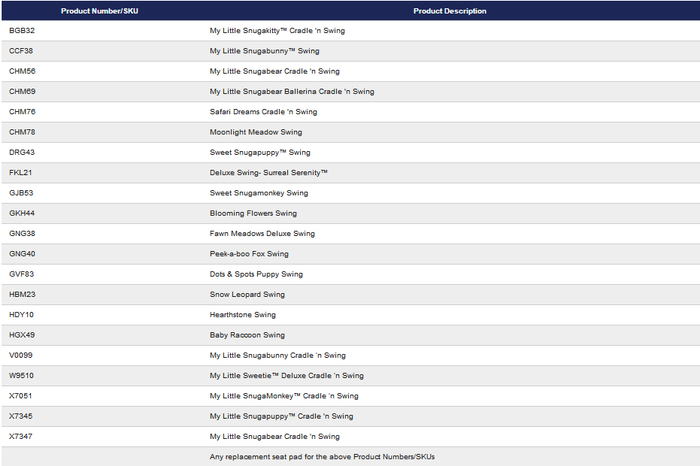 该系列婴儿摇椅可以前后和侧摆动,摆动幅度可以达到90度旋转,并且有座椅靠背能够折叠收纳。被召回的产品共有21个型号,设计原理相同,仅在织物颜色和玩具配件上略有差别。