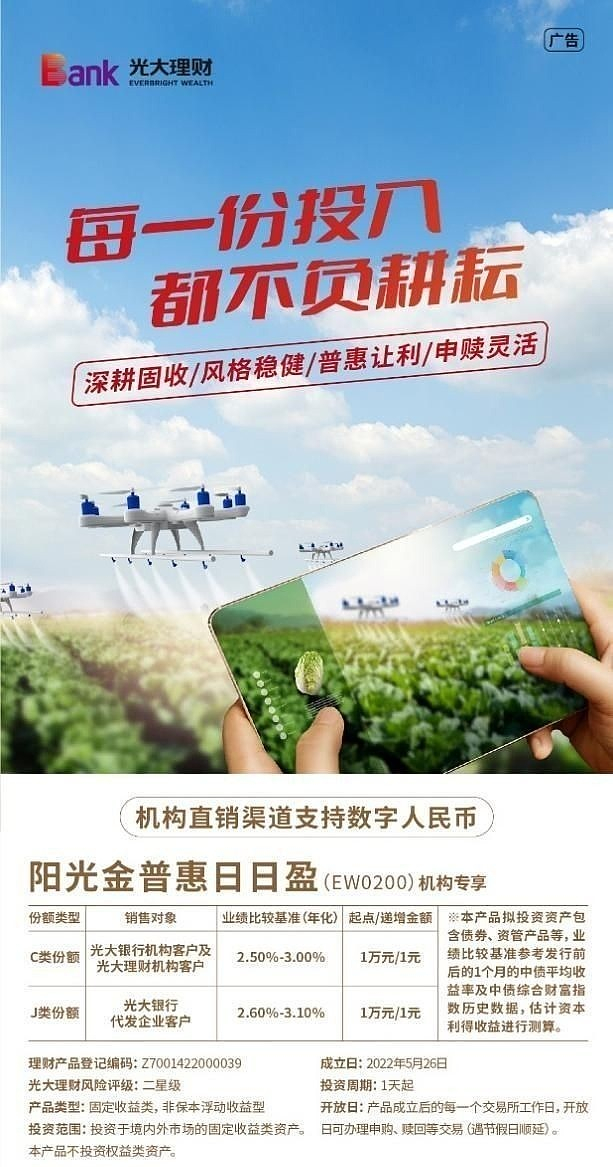 2022年,光大理财针对中小微企业创设了专属理财产品“阳光金普惠日日盈”,该产品面向机构客户发行,全部投资于固定收益类资产,产品设定为1万元起投,符合中小微企业的小额理财需求,风险评级二星级,综合费率较低,实现了让利投资者的目的。截至今年10月末,该产品累计规模达到22.5亿元,服务中小微企业客户超过700户,成立以来年化收益率2.74%,大幅跑赢业绩比较基准,并充分满足了中小微企业流动性资金的增值保值需求。