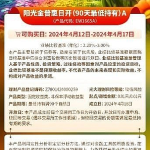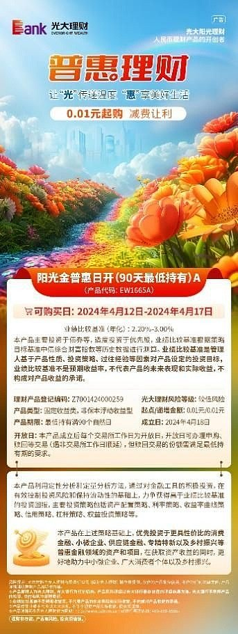 阳光金普惠日开(90天最低持有)A秉持降低理财门槛、服务广大中小微企业的普惠理念,设置1分钱起购、1分钱追加,并将管理费率(年化)、销售服务费率(年化)均设置为0.1%,同时自2024年4月18日起该产品服务费率(年化)进一步优惠至 0.05%,减费让利投资者;在投资端,在风险适配的基础上,所募资金投资于个人消费金融、小微企业、供应链金融、专精特新以及乡村振兴等普惠金融领域的资产和项目(管理人可根据最新国家政策或监管规定调整普惠金融领域资产范围)的投资比例将不低于80%,在获取资产收益的同时,更好地助力中小微企业、广大消费者个体以及乡村振兴的发展,为普惠金融高质量发展贡献光大力量。