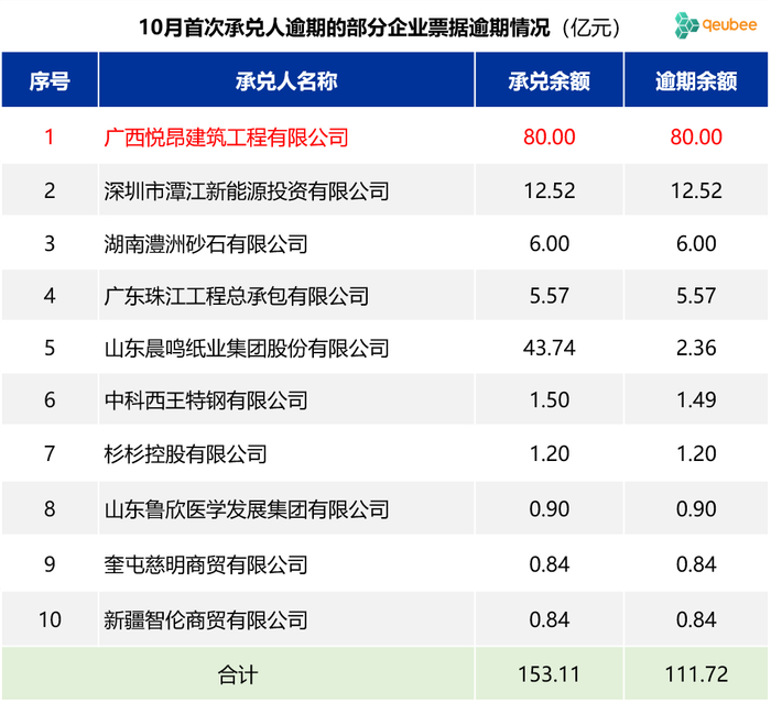 10月首次逾期的企业出现两个特点,一个是商票逾期金额大,广西悦昂建筑工程有限公司逾期80亿元、深圳市潭江新能源投资有限公司逾期12.52亿元,但工商信息显示这两家企业均为小型私营企业;另一个是逾期知名企业不少,山东晨鸣纸业集团股份有限公司、杉杉控股有限公司均为首次逾期。上述这些企业未发生信用风险,请尽快结清逾期票据并在信息披露平台进行公告。