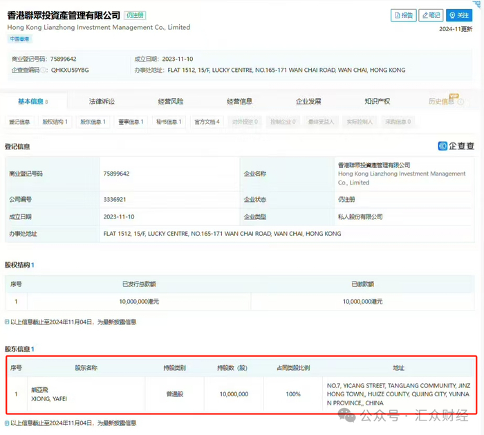 企查查显示,香港联众投资产管理公司的实控人并非“王炎”,而是熊亚飞,且仅有这一人;登记的个人地址位于云南省曲靖市会泽县金钟镇。