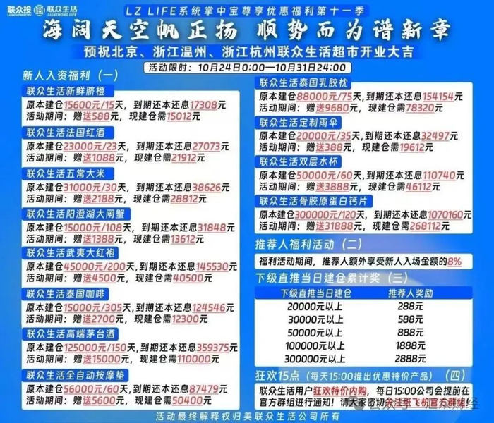 银柿财经获得的一张海报显示,仅11月9日至30日,全国各地就计划开28家联众生活超市。有投资者表示,线下超市均正常营业、可以购物消费,超市管理人都是团队达到一定人数的联众投成员。
