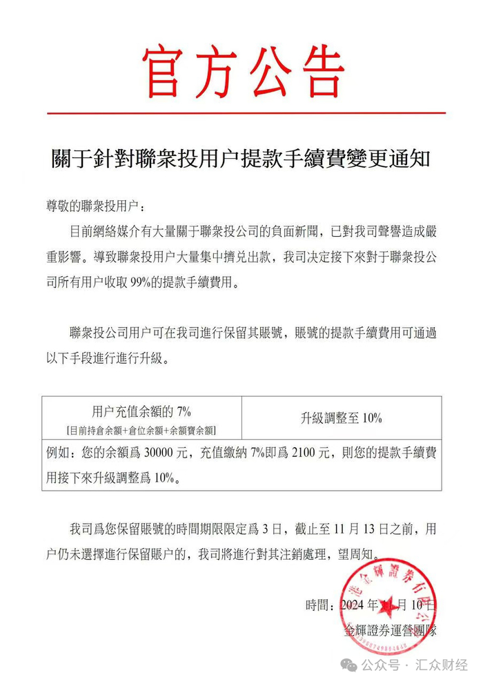然而,2024年11月10日,也就是公司成立一周年这天,“王炎”在内部群聊里发出一则盖有“香港金辉证券有限公司”印章的公告,称由于联众投用户大量集中挤兑出款,决定接下来对于联众投公司所有用户收取99%的提款手续费用。如想要降低手续费,则需向账户中充值余额的7%。如果3天内(11月13日前)未完成充值,公司将注销其账户。