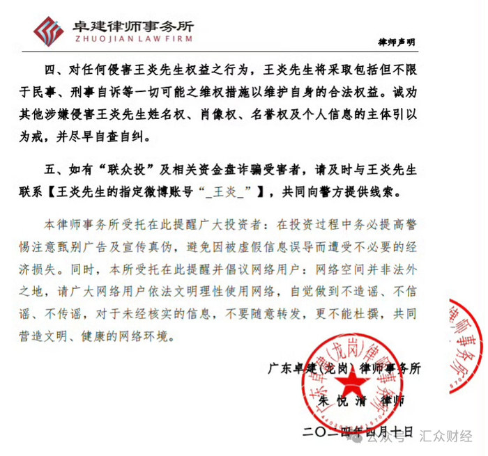 对上述联众投宣传内容,王炎回应,联众投使用的宣传照片确是其本人,为盗用;工作履历的部分是公开信息,被盗用,其余炒股相关内容均为联众投杜撰;自己也从未在公开场合或者平台做过面向散户的炒股相关分享或发表股市相关观点。