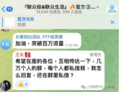 数字准确性虽无法查证,但陈雨提供的一张聊天截图显示,联众投的成员被分成了多个大组,仅“333组”和“777组”的共同群聊里,就有超过1.4万人。如果按70万人每人至少投入12600元测算,联众投资金总规模可能已达到百亿级别。