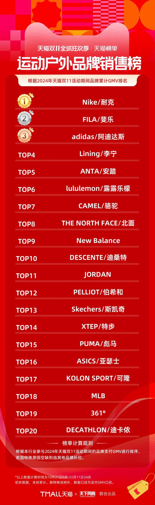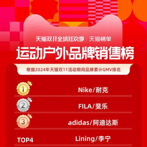 耐克、斐乐、阿迪排名天猫双十一运动榜前三,骆驼占据户外榜头名