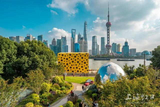 在展厅外的北外滩国客中心码头,随便一拍都非常出片,举起喜茶与草间弥生联名的杯子,就能与白玉兰广场与W酒店同框。