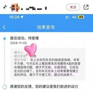 该网友还在中国铁路公众号上提出建议,内容为车上女性列车乘务员的服装是短裙,非常不方便,在车上看到列车乘务员弯腰帮A座的旅客处理座椅问题,裙子开叉高,长度很短,已经在走光的边缘,且列车乘务员在车上经常需要弯腰之类的劳动,裙子不方便工作,建议改成裤子。