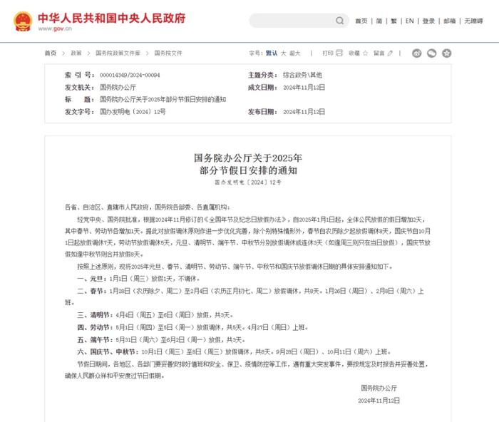 国务院还强调了“合理调休”这一点,指出“除个别特殊情形外,法定节假日假期前后连续工作一般不超过6天”。与2024年相比,2025年因调休需要上班的周末天数从8天减少至5天,减少了37.5%。这样就给企业更多的灵活性,使员工的工作与生活更加平衡,同时也促进了消费市场的健康发展。