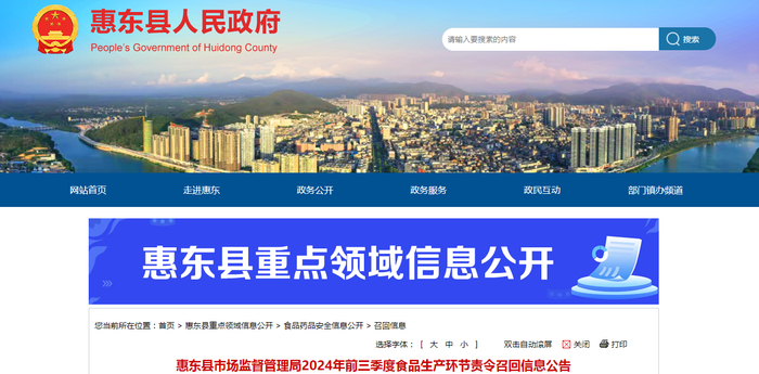广东省惠州市惠东县市场监督管理局2024年前三季度食品生产环节责令召回信息公告