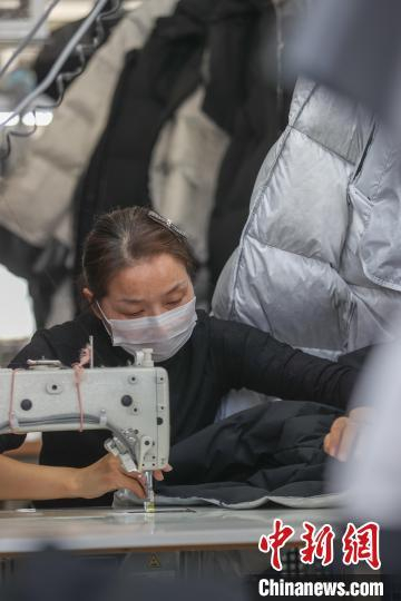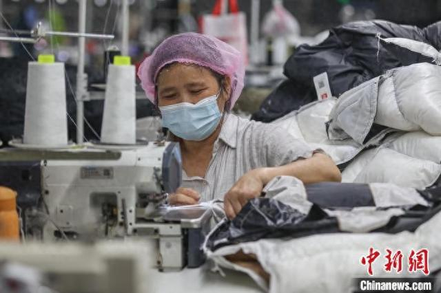 图为11月12日,位于共青城的“鸭鸭”智能制造标准化样板工厂内,工人正在赶制羽绒服。“鸭鸭”的前身共青羽绒厂是共青城第一家羽绒服生产企业,半个多世纪以来,共青城孕育了“鸭鸭”以及众多羽绒服饰品牌,逐步形成了羽绒服装从设计研发、加工制造到市场营销的全产业链。中新社记者 刘力鑫 摄