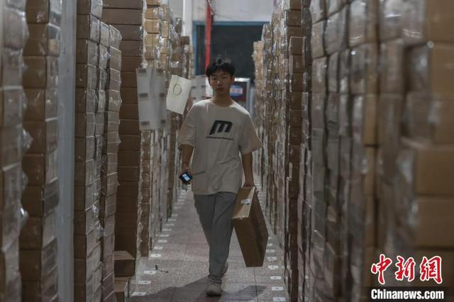 图为11月12日,共青城羽物服饰有限公司的仓库,工作人员拿着一件包装好的羽绒服准备发货。刚刚过去的“双十一”,该企业的销售额达2500多万元人民币。该企业的羽绒服主要以线上销售为主,近年来,共青城市大力实施“互联网+服装产业”战略,推动线上、线下融合发展,推进线上直播平台、智能化工厂等建设,并与各电商平台开展合作,大力拓展羽绒服销售渠道。中新社记者 刘力鑫 摄