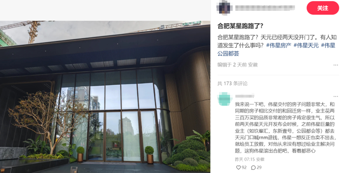 上周末,有网友经过合肥伟星天元项目时,发现售楼处关门了,保安亭被锁头扣住,门前垃圾散落一地。