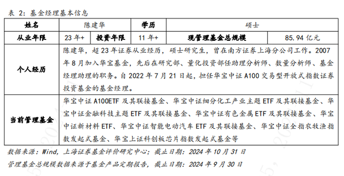基金经理为陈建华,硕士学历,拥有23年证券从业经验和超11年投资管理经验。曾在南方证券上海分公司工作。2007年8月加入华宝基金,先后在研究部、量化投资部任助理分析师、数量分析师、基金经理助理的职务。截至2024季末,在管规模为85.94亿元。