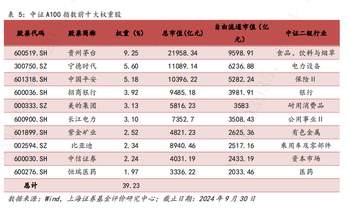 中证A100指数聚集A股各行业最核心龙头,兼顾蓝筹价值与新兴成长。截至2024年9月30日,中证A100指数前十大权重股占比合计为39.23%,前十大权重股平均市值为8722.69亿元。前十大权重股中,既有食品饮料、金融等传统行业龙头如贵州茅台、中国平安、招商银行、中信证券,又有宁德时代、比亚迪等硬科技公司。